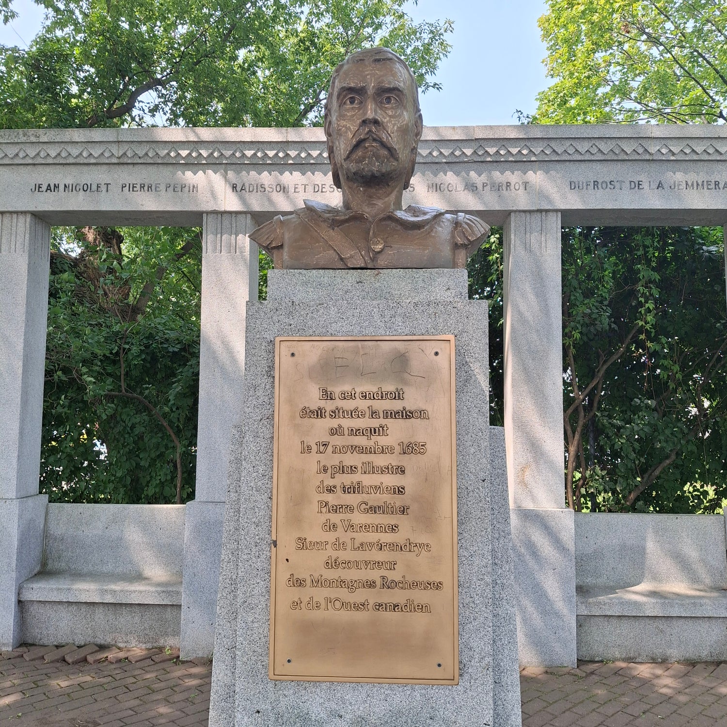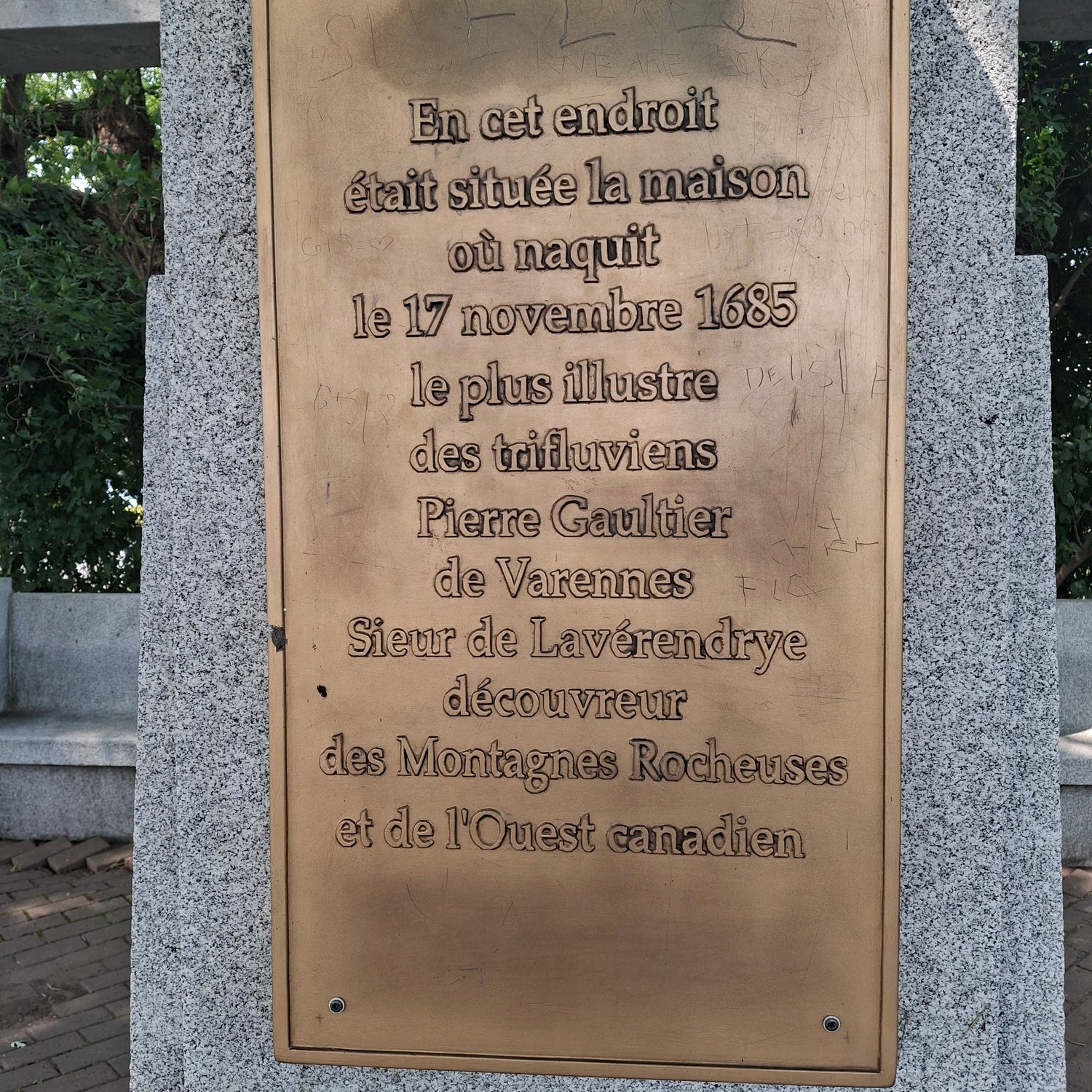 En cet endroit était située la maison où naquit le 17 novembre 1685 le plus illustre des trifluviens Pierre Gaultier de Varennes • Sieur de Lavérendrye découvreur des Montagnes Rocheuses et de l'Ouest canadien